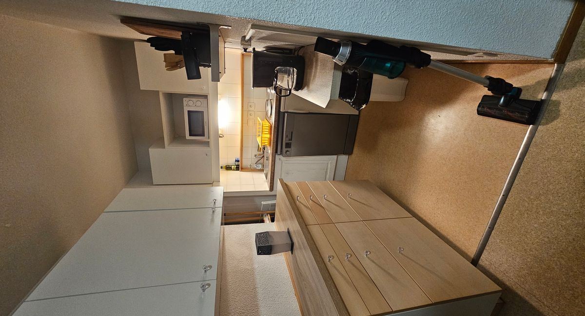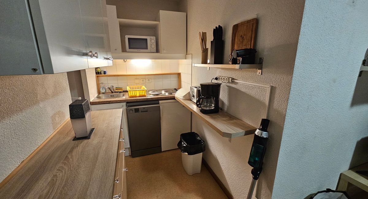L'appartement dispose d'une charmante chambre parentale avec un lit double (2 x 90 cm) et un coin montagne avec deux lits superposés. Le séjour comprend un canapé-lit et un coin cuisine bien équipé avec plaques chauffantes électriques, micro-ondes, lave-vaisselle, réfrigérateur, cafetière électrique, bouilloire, grille-pain et appareil à raclette.