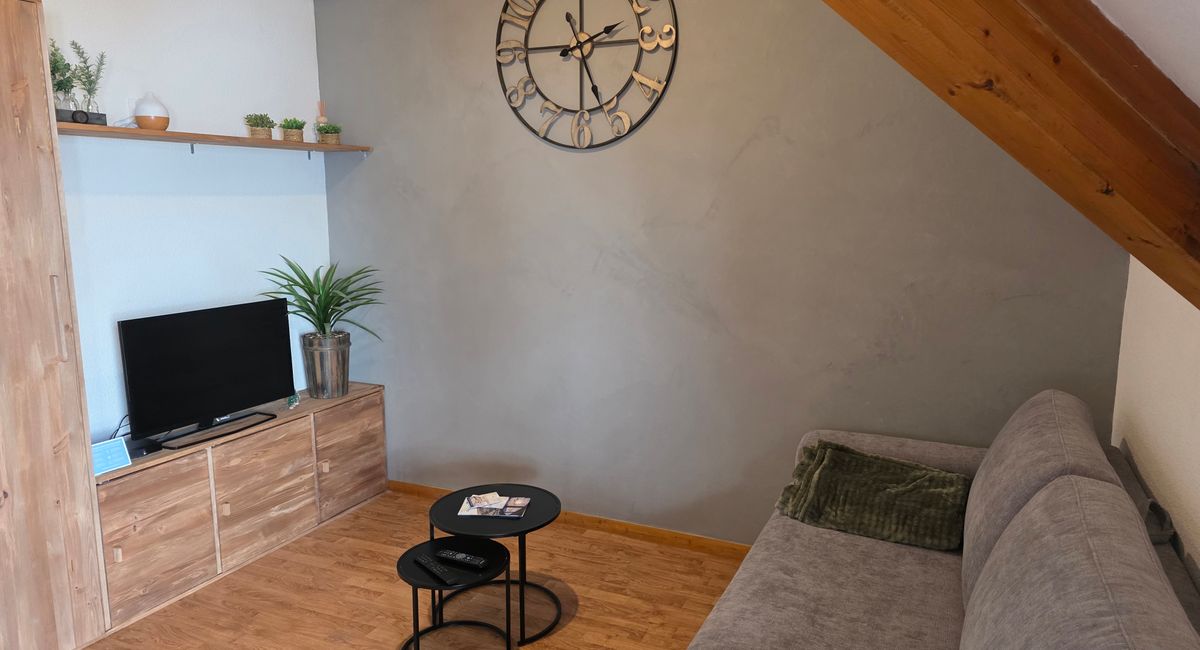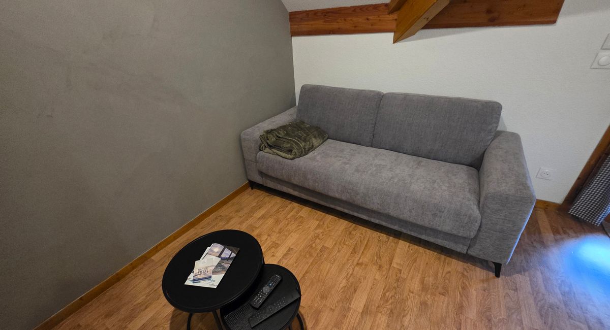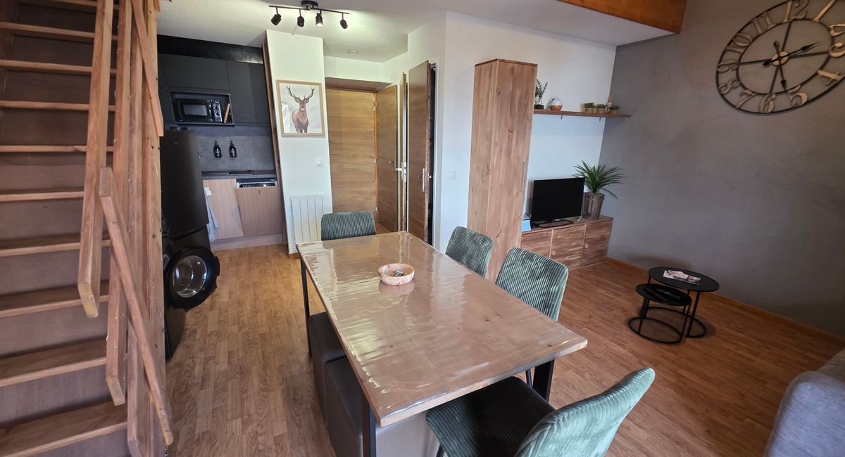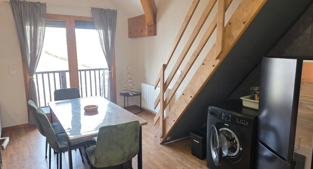 L'appartement se compose d'une entrée, une salle de bain avec baignoire et WC séparés. Un séjour cathédrale avec cuisine équipée ( plaques vitro, lave vaisselle, frigo, micro-onde, bouilloire, grille pain, appareil à fondue , machine à café Nespresso), table basse et TV. Deux chambres confortables à l'étage avec des lits doubles de 140 cm, ainsi que d'un canapé convertible dans le séjour. Un balcon vient compléter l'appartement. Un casier à skis disponibles . Accès à la résidence sécurisé par digicode.