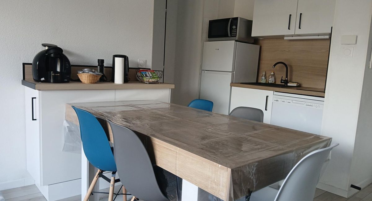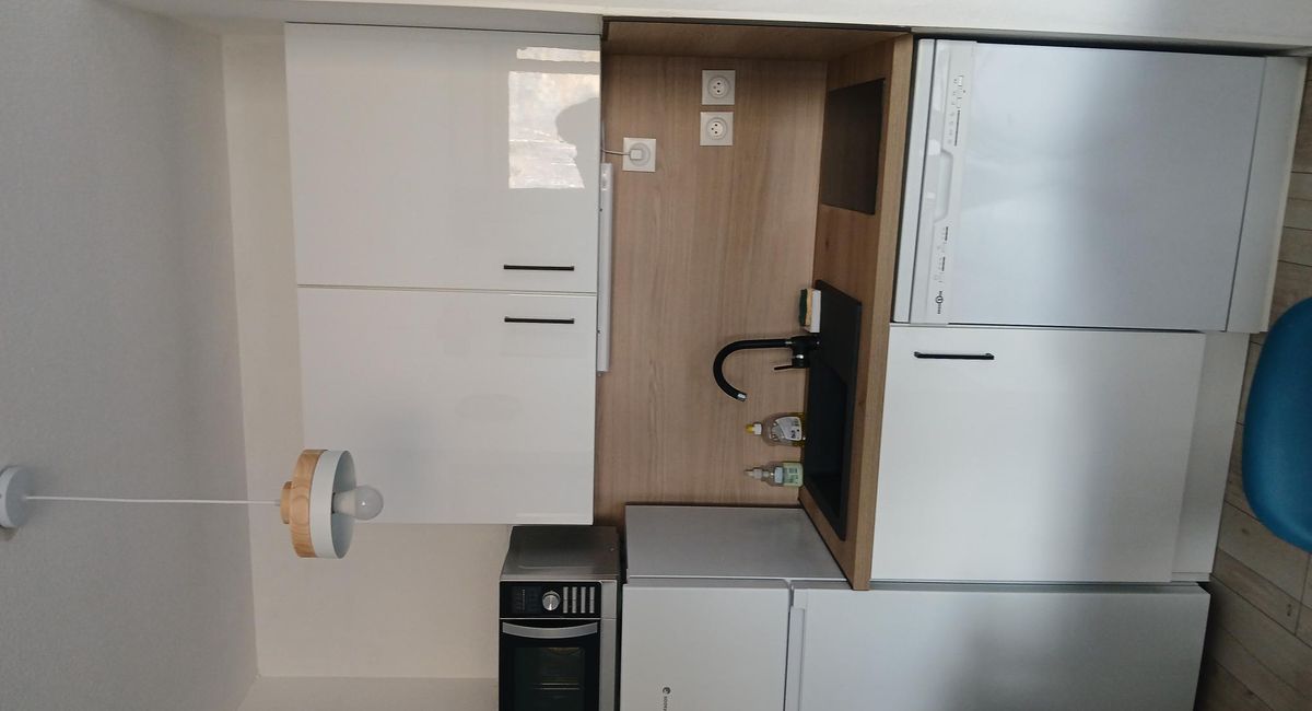 Kitchenette: frigo avec compartiment congélateur, plaque de cuisson domino électrique, four micro ondes multifonction, lave vaisselle, cafetière tassimo et bouilloire, appareil raclette pierrade et multi-crêpes.