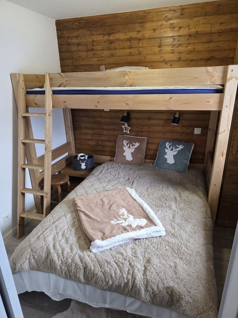 L'appartement dispose d'une chambre avec lit double (140) + 1 lit simple en hauteur ; un canapé convertible dans le salon ; d'une cuisine équipée avec plaques électriques, micro-ondes, lave-vaisselle et tous les équipements de base.